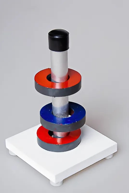 Прибор представляет собой стойку с надетыми на нее тремя постоянными кольцевыми магнитами. Полюса магнитов окрашены в разные цвета.