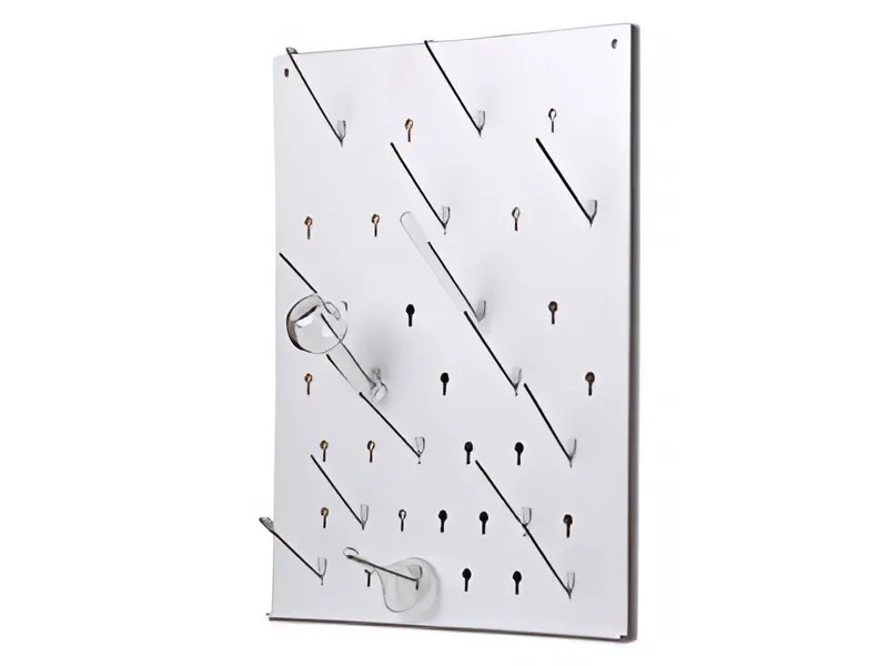 Доска представляет собой пластмассовую панель с 37 отверстиями, в которые вставляются пластиковые держатели для посуды (крючки). Для крепления на стене доска имеет два отверстия, также в комплекте предусмотрены шурупы, дюбели и запасные крючки.