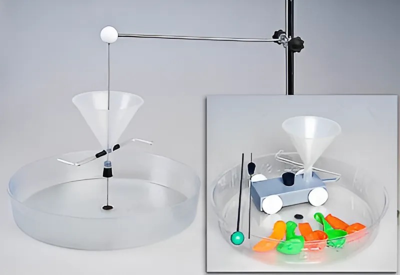 Одна пробка насажена на спицу, вторая вставлена в тележку. Дно конусообразного сосуда снабжено двумя боковыми отверстиями для изогнутых под прямым углом стеклянных трубок и отверстием под резиновую пробку. Шарик на конце держателя для спицы снабжен отверстием для свободного вращения в нем спицы-острия. Пробка надета на спицу-острие.