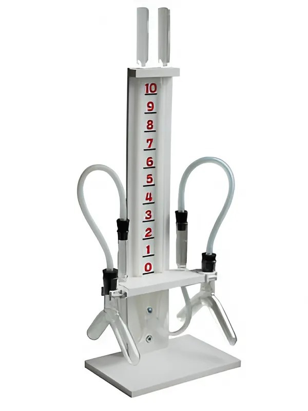 Прибор состоит из двух сосудов Ландольта, связанных с поворотным устройством, двух силиконовых трубок с двумя стеклянными воронками вверху и двумя внизу. Верхние воронки предотвращают выброс жидкости из трубок в случае очень быстрого ее подъема; нижние служат резервуаром для окрашенной жидкости при заполнении трубок по всей длине шкалы. Манометрические трубки и сосуды Ландольта соединяются силиконовыми трубками с резиновыми пробками на концах. Прибор смонтирован на платформе с оцифрованной шкалой.