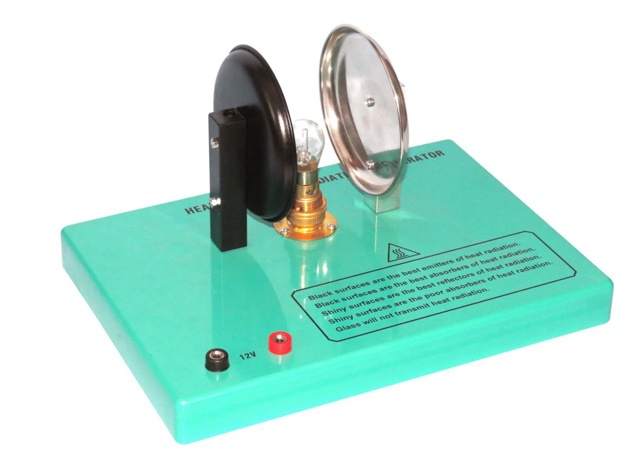 Два параболических металлических диска с различным покрытием (зеркальный и черный) расположены напротив друг друга по обоим сторонам от лампы. Позади каждого из дисков имеется гнездо для установки лабораторного термометра (термометр в комплект не входит). Два разъема для подключения лампы к источнику питания установлены на основании прибора.