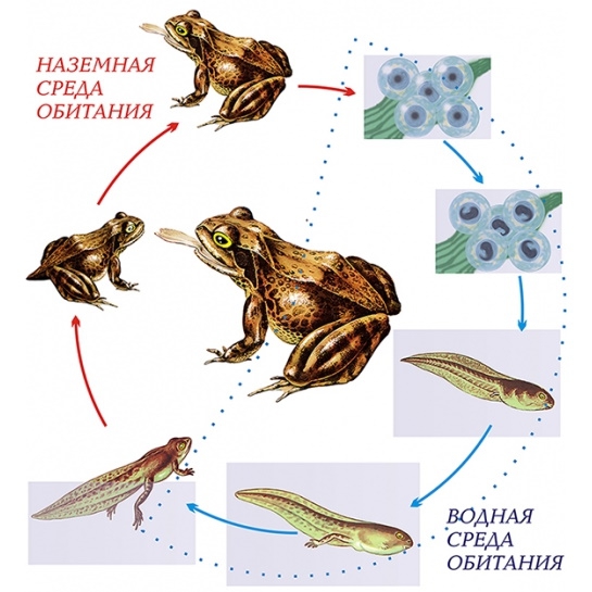 Отличительной особенностью этого класса является то, что земноводным для жизни необходима вода. Даже если тот или иной вид земноводных во взрослом состоянии всю жизнь проводит на суше, размножаться он способен исключительно в воде. Лягушки спариваются в водоемах, после чего самка мечет икру, а самец оплодотворяет ее. Из икры развивается личинка лягушки, которая называется головастиком. Для головастика характерно то, что он приспособлен для жизни в воде и по своему строению напоминает малька рыбы. У него есть жабры, двухкамерное сердце, один круг кровообращения и боковая линия.