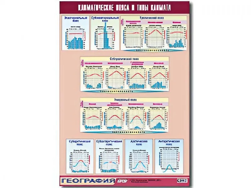 Главная Каталог Демонстрационные учебно-наглядные пособия Кабинет географии Таблица демонстрационная "Климатические пояса и типы климата" (винил 70*100)