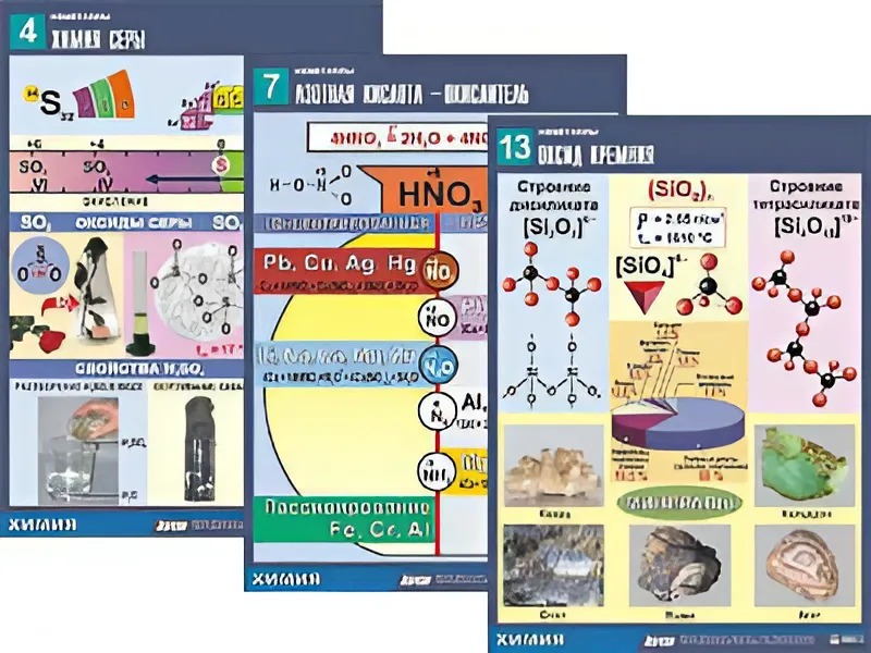 Комплект охватывает следующие темы: "Галогены", "Химия галогенов", "Сера. Аллотропия", "Химия серы", "Химия азота", "Оксиды азота", "Азотная кислота - окислитель", "Фосфор. Аллотропия", "Классификация минеральных удобрений", "Распознавание минеральных удобрений", "Углерод. Аллотропия", "Адсорбция", "Оксид кремния", "Силикаты", "Применение кремния и его соединений", "Инертные газы".