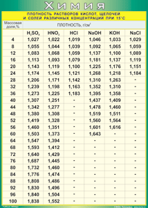 Таблица "Плотность растворов кислот, щелочей и солей различных концентраций при 15°C" (100х140 сантиметров, винил)
