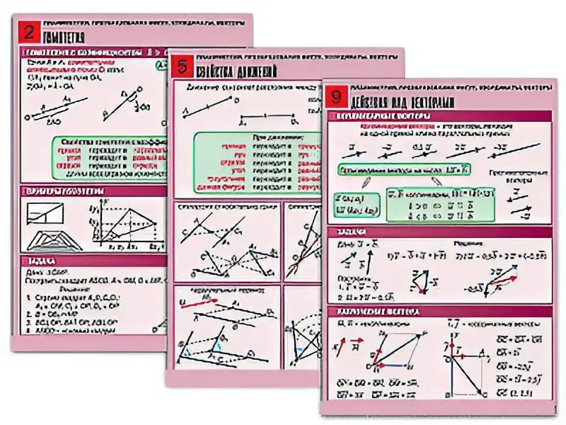 Комплект учебно-наглядных пособий "Планиметрия. Преобразования фигур. Координаты. Векторы" формата А1 с полноцветной двухсторонней печатью и матовой двухсторонней ламинацией в количестве 10 таблиц.