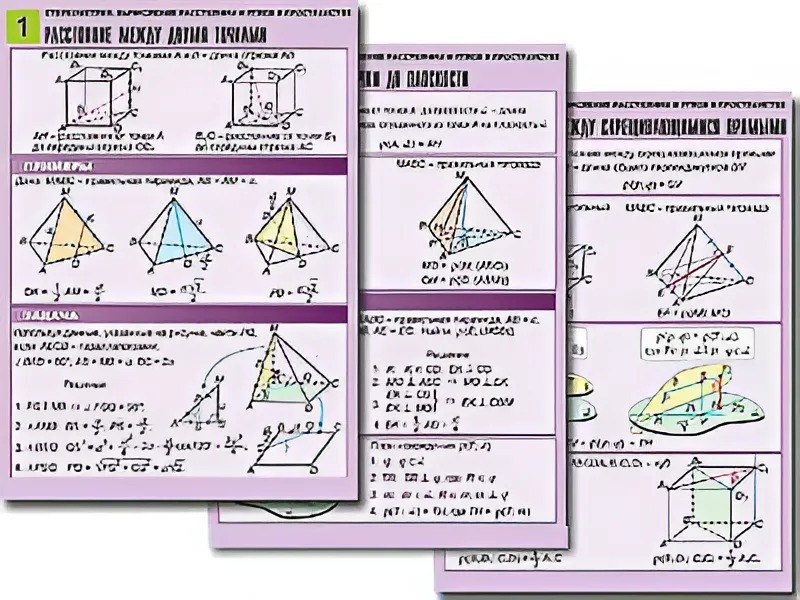 Комплект учебно-наглядных пособий "Стереометрия. Вычисление расстояний и углов в пространстве" формата А1 с полноцветной двухсторонней печатью и матовой двухсторонней ламинацией в количестве 8 таблиц.