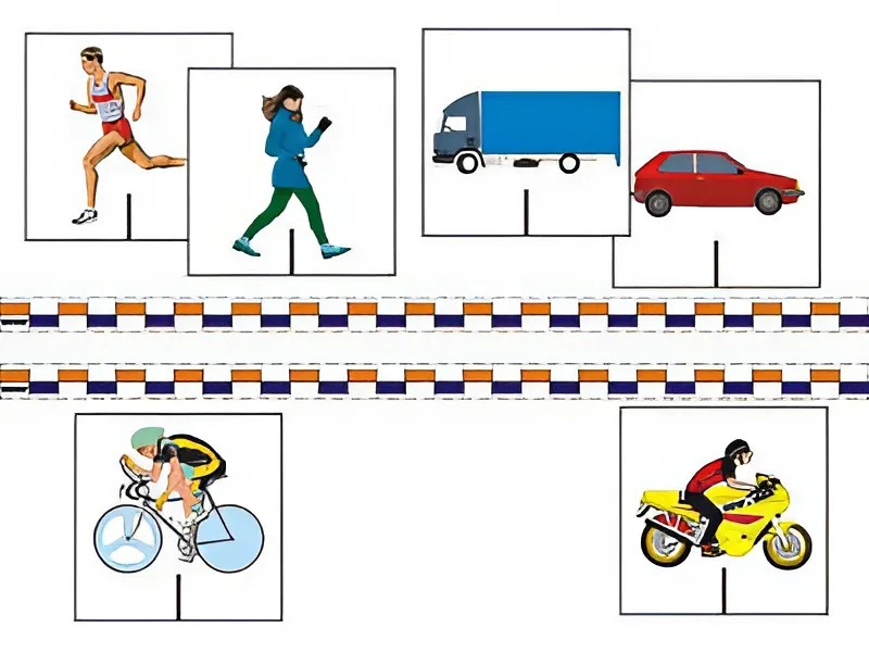 Пособие крепится на классную доску магнитными кнопками. Карточки с изображениями людей и транспортных средств также снабжены магнитами, что позволяет легко крепить их и передвигать по доске. На лицевой стороне карточки нанесена прямая, предназначенная для совмещения со штрихами разметки.
