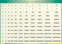 Главная Каталог Демонстрационные учебно-наглядные пособия Кабинет математики Таблица "Таблица степеней" (100х140 сантиметров, винил)