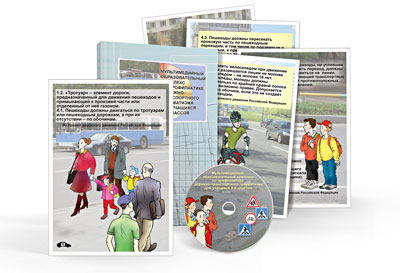 CD-диск содержит изображения и текстовый теоретический материал на тему ПДД и правил поведения в различных дорожных ситуациях, задания и вопросы для учащихся, методическое пособие для учителя, содержащее методические рекомендации по проведению занятий.
