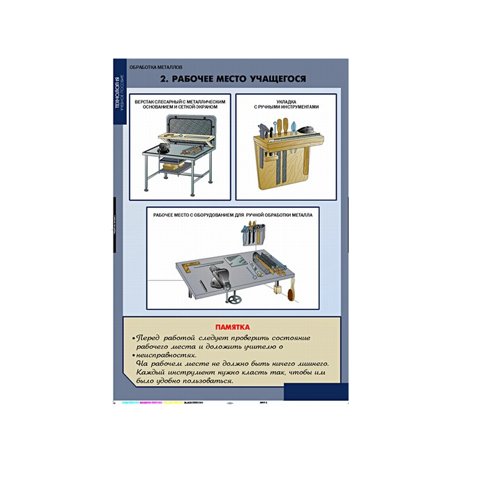 Общие правила поведения в учебных мастерских. Рабочее место учащегося. Инструменты для ручной обработки. Графическое изображение деталей. Технологическая карта. Разметка заготовок. Правка, гибка, рубка металла. Разрезание, опиливание металла. Резьба, её виды. Сверление, точение. Сборка деталей, отделка изделий.