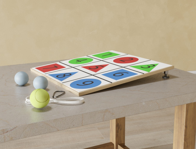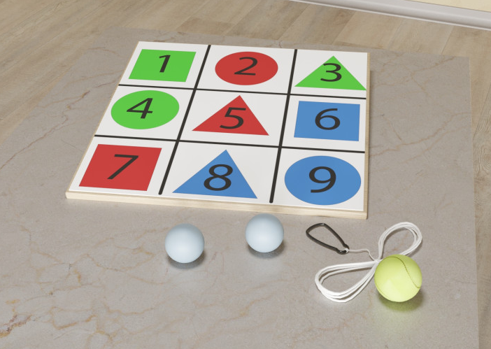 В данном наборе находится мишень напольная и 3 мяча для попадания по ней. Разделена мишень на девять квадратов. В каждом квадрате находится своя геометрическая фигура и определенная цифра, а также цвет. Существует множество вариантов упражнений с такой мишенью. Можно дать задание ребенку кидать мячик в определенную фигуру, цифру или цвет. Можно таким образом решать примеры. После регулярных занятий можно усложнять игры. Также для более лучшего результата рекомендуется заниматься с такой мишенью на балансировочной доске Бильгоу. Упражнения помогут развить у ребенка зрительную и моторную координацию, умение быстро считать, а также ловкость и скорость, так как мячики сами будут отскакивать от мишени и возвращаться к ребенку.