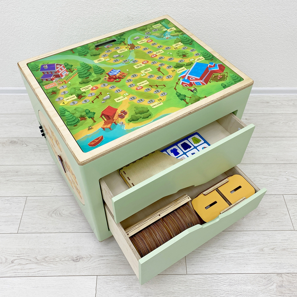 Мобильный куб на колёсиках может передвигаться в любое место класса, где детям удобнее заниматься, по бокам он оформлен бизибордами «Колесо настроения» и «Времена года», а сверху на крышке – красочная пошаговая игра-бродилка с вопросами на английском. Внутри в удобных ящиках спрятались: дидактические карточки, игра «Дубль», сортеры, пазлы, лото, домино, книга First Book.