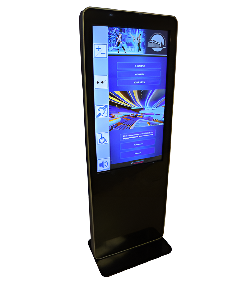 Информационный терминал ISTOK 55P с сенсорным экраном 55’’, со встроенной индукционной системой (для передачи звука на слуховые аппараты), со специальным ПО для инвалидов INVA TOUCH с сенсорным управлением для незрячих людей, с автоматическим озвучиванием текста голосом.