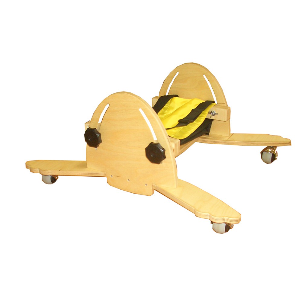 Опора представляет собой полностью разборную конструкцию: основа на самоориентирующихся колесах, на которой закрепляются вертикальные регулируемые стойки с комплектом креплений для корпуса ребенка.