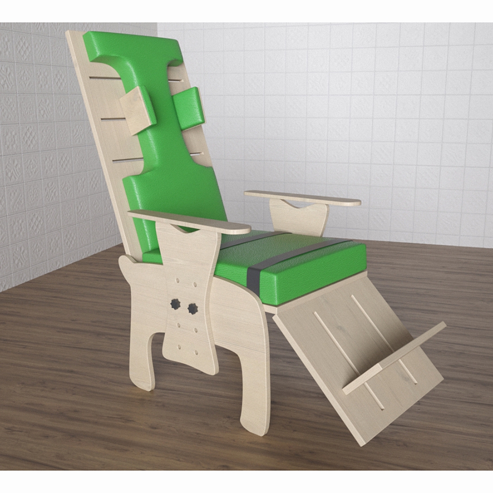 Детский стул представленной модели имеет регулируемую подножку, что облегчает процесс привыкания к сидячему положению ребенка с нарушениями в области ОДА. Конструкция стула была разработана с учётом всех особенностей вышеупомянутых особенностей и растущего детского организма. Фиксаторы головы, подлокотники и подножку можно отрегулировать до нужной высоты; есть надежные ремни для стабилизации тазового пояса и верхней части ног ребенка. Предназначен для оборудования кабинетов специалистов, занимающихся реабилитацией детей с ОВЗ, учебных помещений в центрах коррекции и реабилитации.