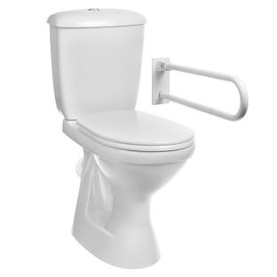 Унитаз-компакт для инвалидов поставляется в комплекте с откидным поручнем. Он будет очень удобен для пожилых людей и для людей с нарушениями опорно-двигательного аппарата. В состав комплекта входит унитаз, который расположен на 5 см выше обычного и откидной окрашенный поручень. Использование подобной сантехники уже становится привычным явлением и стандартом в местах общественного пользования и местах проживания людей с ограниченными двигательными возможностями. Преимуществами использования унитаза для инвалидов является облегченная посадка и подъем и меньшая нагрузка на суставы.
