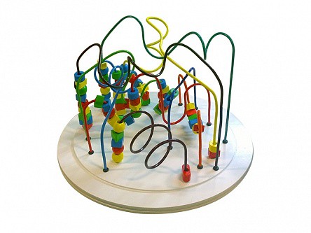 Игровой комплекс выполнен в настольном исполнении, а установленные на нем проволочные лабиринты с деревянными бусинками предназначены для тренировки у детей "пинцетного захвата", а также развития мышц, отвечающих за удержание и использование кистей и ложек.