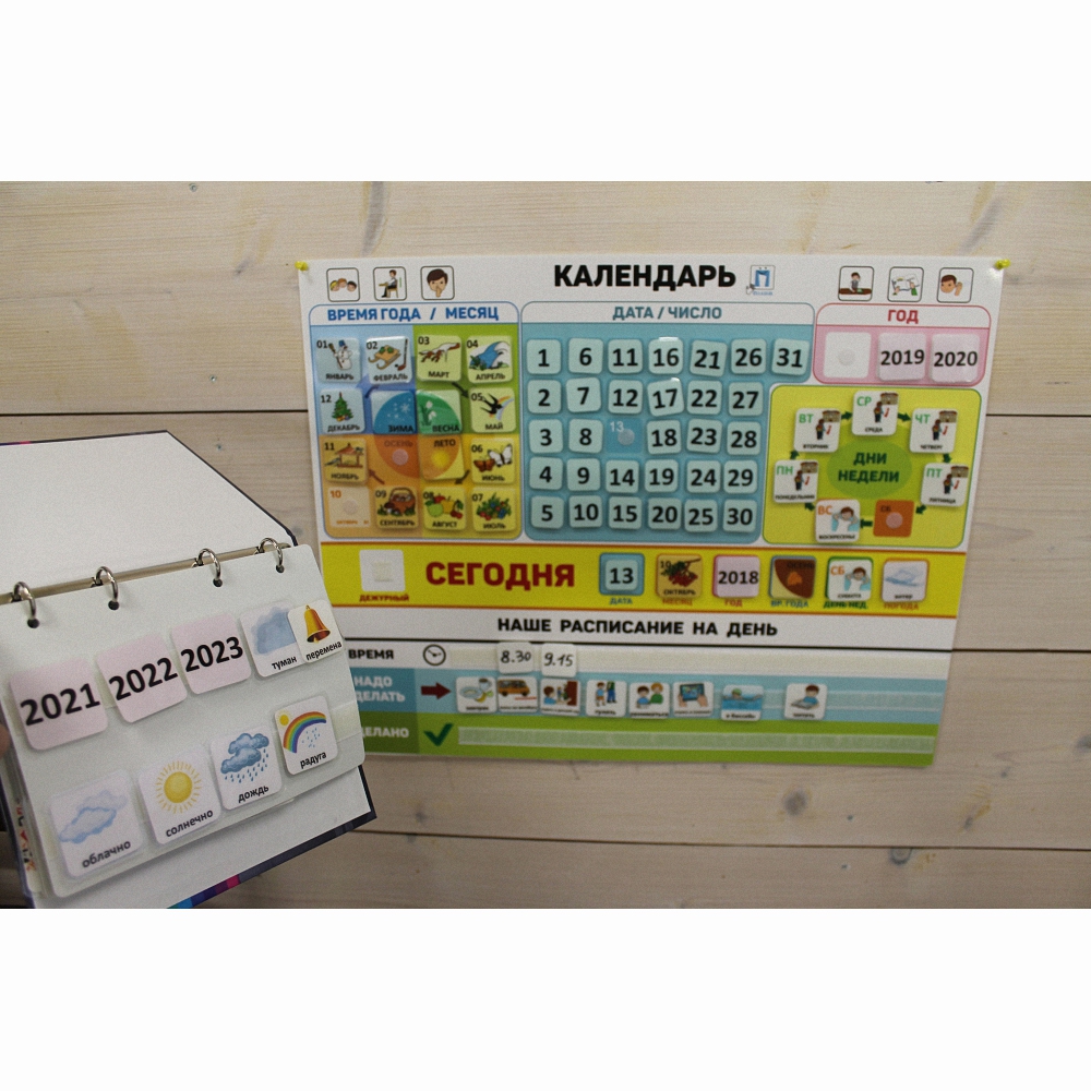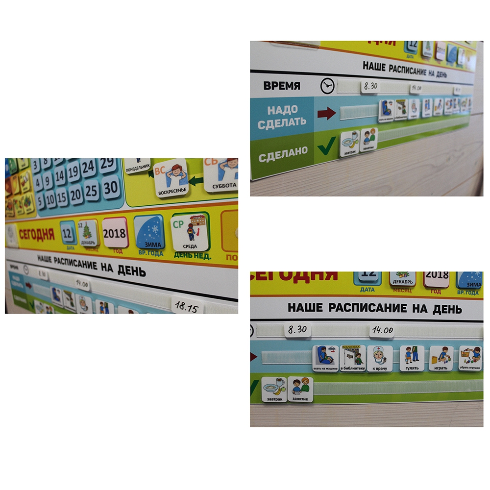 Воспринимая визуальную информацию, ребенок также закрепляет знания моторными навыками, переставляя карточки в строке "сегодня" и в расписании на день.