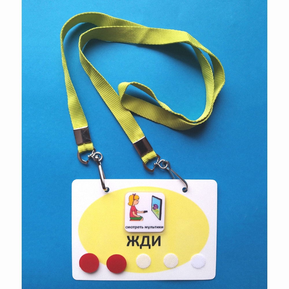 Планшет изначально имеет только 1 кружок - липучку для одного жетона. Ещё 4 липучки входят в комплект, но будут приклеиваться на планшет постепенно, когда ребёнок научится ждать дольше.