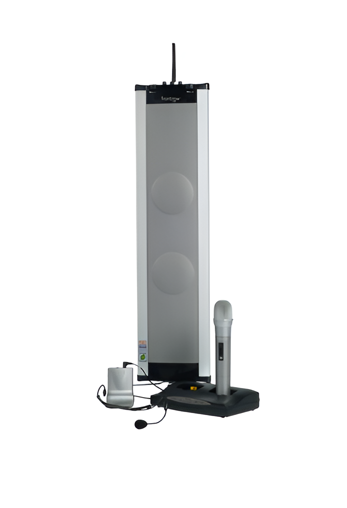 Внутри колонки находятся два громкоговорителя, обеспечивающих оптимальную направленность. Звуковые волны из громкоговорителей усиливаются в центре и распространяются по всей зоне слышимости, увеличивая охват помещения и повышая четкость сигнала. Благодаря этому одной системы достаточно для использования в классе. Два микрофона могут использоваться одновременно для группового преподавания или участия учащихся во время урока.