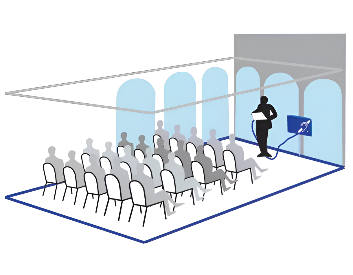 Стационарная индукционная петля монтируется в пол, потолок или стены по периметру помещения и соединяется с усилителем, расположенным в непосредственной близости от петли. Питание усилителя осуществляется от сети переменного тока. Звуковая информация поступает на микрофон и передается в слуховой аппарат посредством электромагнитной индукции (режим «Т») равномерно во всей зоне охвата петли. Стационарная индукционная петля может быть подключена к системам оповещения, громкой связи и другим источникам сигнала.