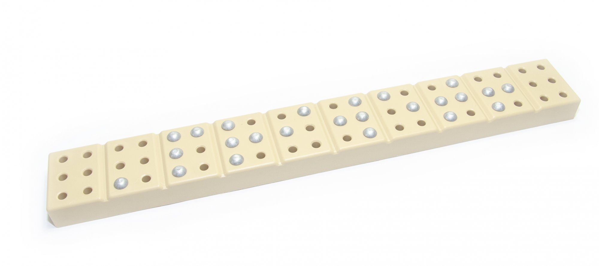 С помощью штифтов на планке можно производить набор цифр, букв и слов. Планка выполнена из пластика. Штифты изготовлены из металла.