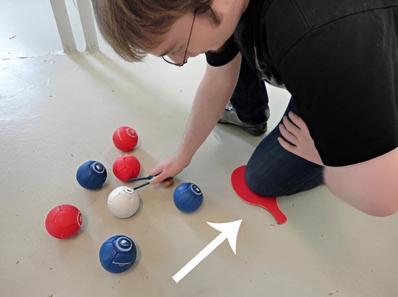 С помощью двусторонней ракетки (одна сторона красная, другая - синяя) судья показывает, чья очередь вбрасывать мяч. Также может использоваться для защиты коленей судьи при измерении расстояния между мячами.