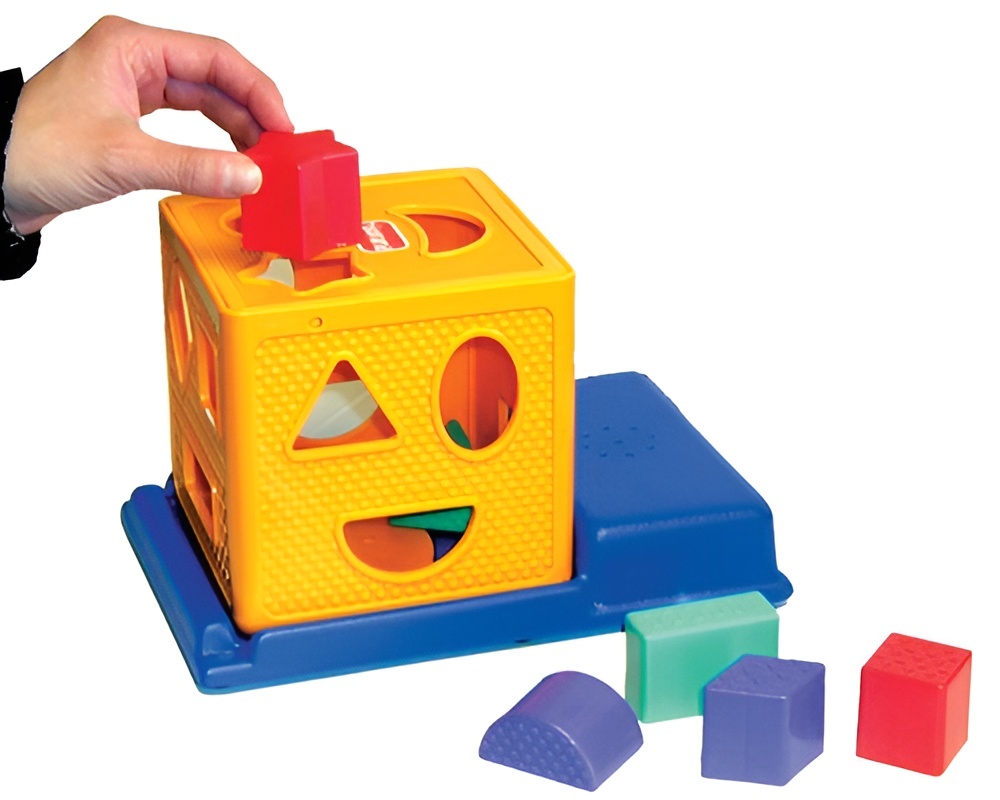 Все 5 сторон куба имеют отверстия для сортировки. Когда одна из разноцветных геометрических фигур попадает в куб и падает на дно - звучит записанное ранее сообщение (длительностью до 20 секунд). Способствует развитию речи, слуховых рефлексов, хватательных рефлексов, распознаванию цветов и формы.