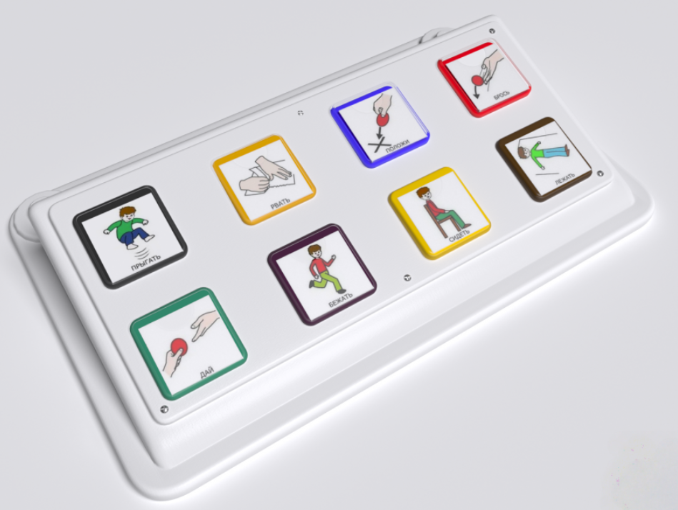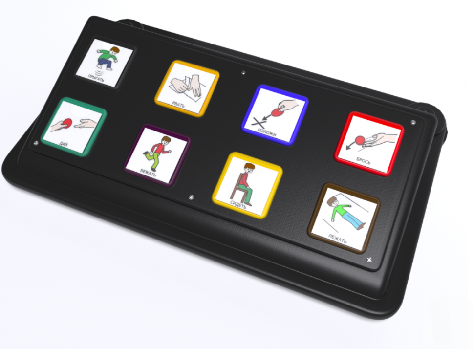 8-ми кнопочный многоуровневый игровой коммуникатор предназначен для развития детей, имеющих проблемы со слуховым, тактильным, зрительным восприятием и коммуникацией (аутизм, ДЦП). Представляет собой прямоугольный корпус, задняя часть которого слегка возвышена над передней под плавным углом, на котором размещены 8 кнопок с окошками для подписанных демонстрационных карточек. Изготовлено из высококачественного ударопрочного пластика, имеет обтекаемые плавные формы без острых краёв и углов. Есть возможность подключения до 4-х выносных кнопок.