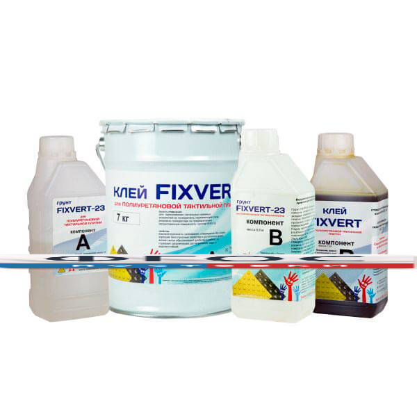 Клей поставляется в комплекте, состоящем из двух компонентов грунта и двух компонентов клея. Клей предназначен для прочной и долговечной фиксации полиуретановой тактильной плитки на асфальтовые, бетонные, полимерные покрытия. Клей поставляется совместно с 2х компонентным грунтом. Предварительное грунтование поверхности способствует увеличению адгезионных свойств как подстилающей поверхности, так и поверхности тактильной плитки. Фасовка не более 7 кг суммарная для всех компонентов.
