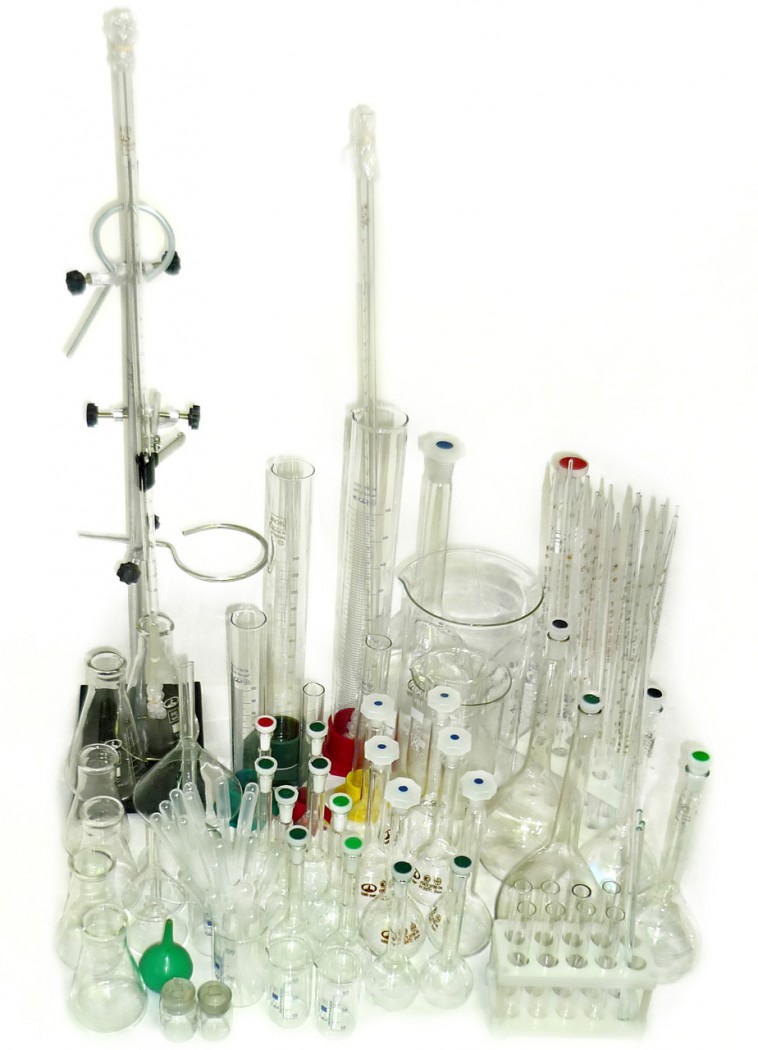 Набор стеклянной химической посуды, принадлежностей и оборудования, предназначен для применения в лабораторных условиях при измерении и дозировании объемов жидкостей, фильтровании, титровании в ходе проведения химических анализов и подготовки к ним.