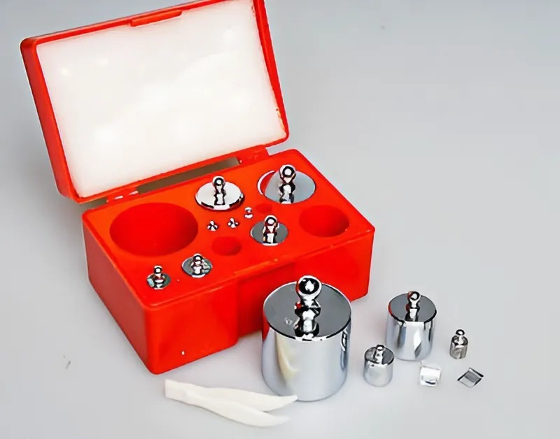 Гири промаркированы и уложены в ячейки коробки. В набор входит также пинцет для захвата гирь и руководство по эксплуатации.