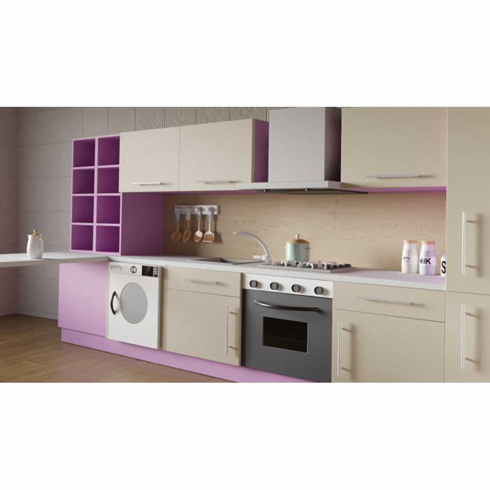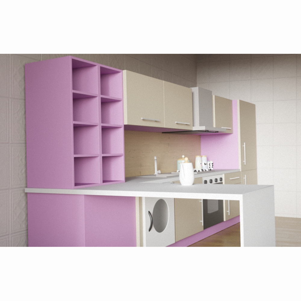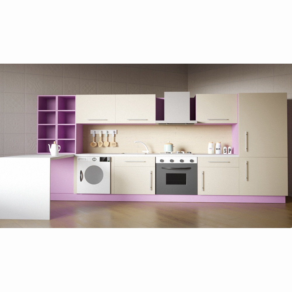 Детский игровой комплект мебели этой модели – стильное и полезное решение для группы детского садика или детской комнаты девочки. Фасад детской кухни выкрашен в спокойные тона нежно-лилового, бежевого и белого; имеет удобную угловую конструкцию и изготовлен из материалов высокого качества – все это залог безопасной и увлекательной детской игры.