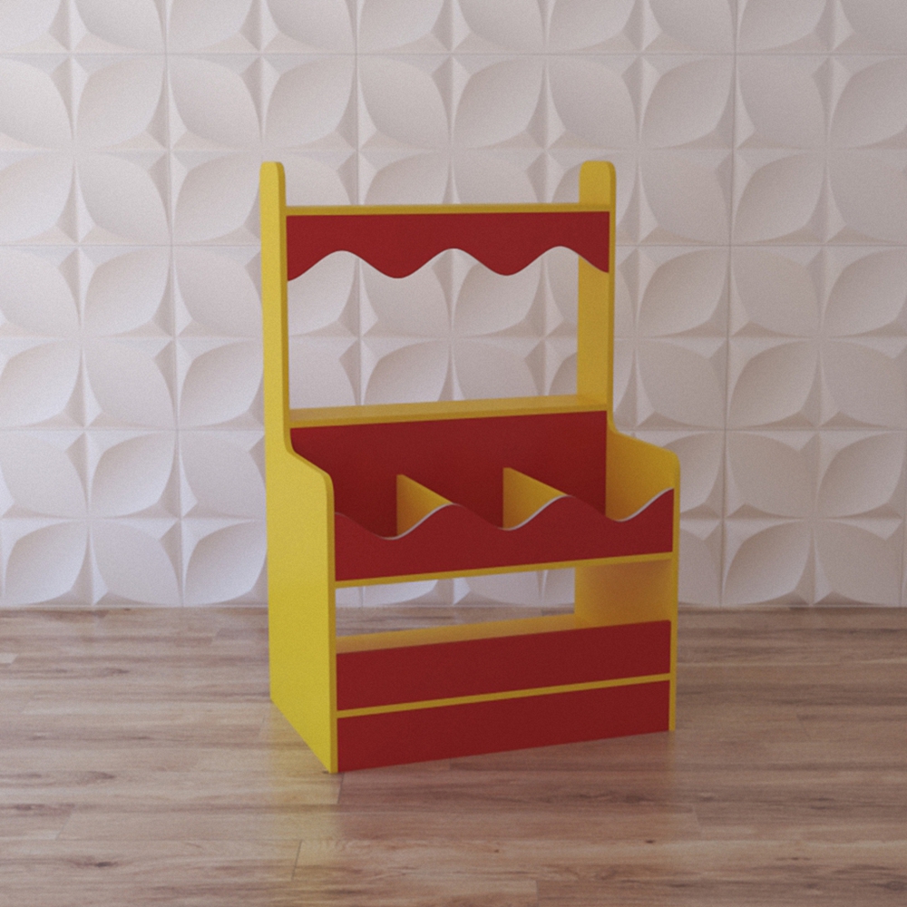 Игровое оборудование в виде прилавка предназначено для детей от 3 лет. Тематически востребованное оформление делает его незаменимым для весёлых сюжетных детских игр. Игровой модуль “Весёлые покупки” представляет из себя уменьшенную копию магазинного стеллажа-прилавка с полочками, окрашен в красно-жёлтые тона.