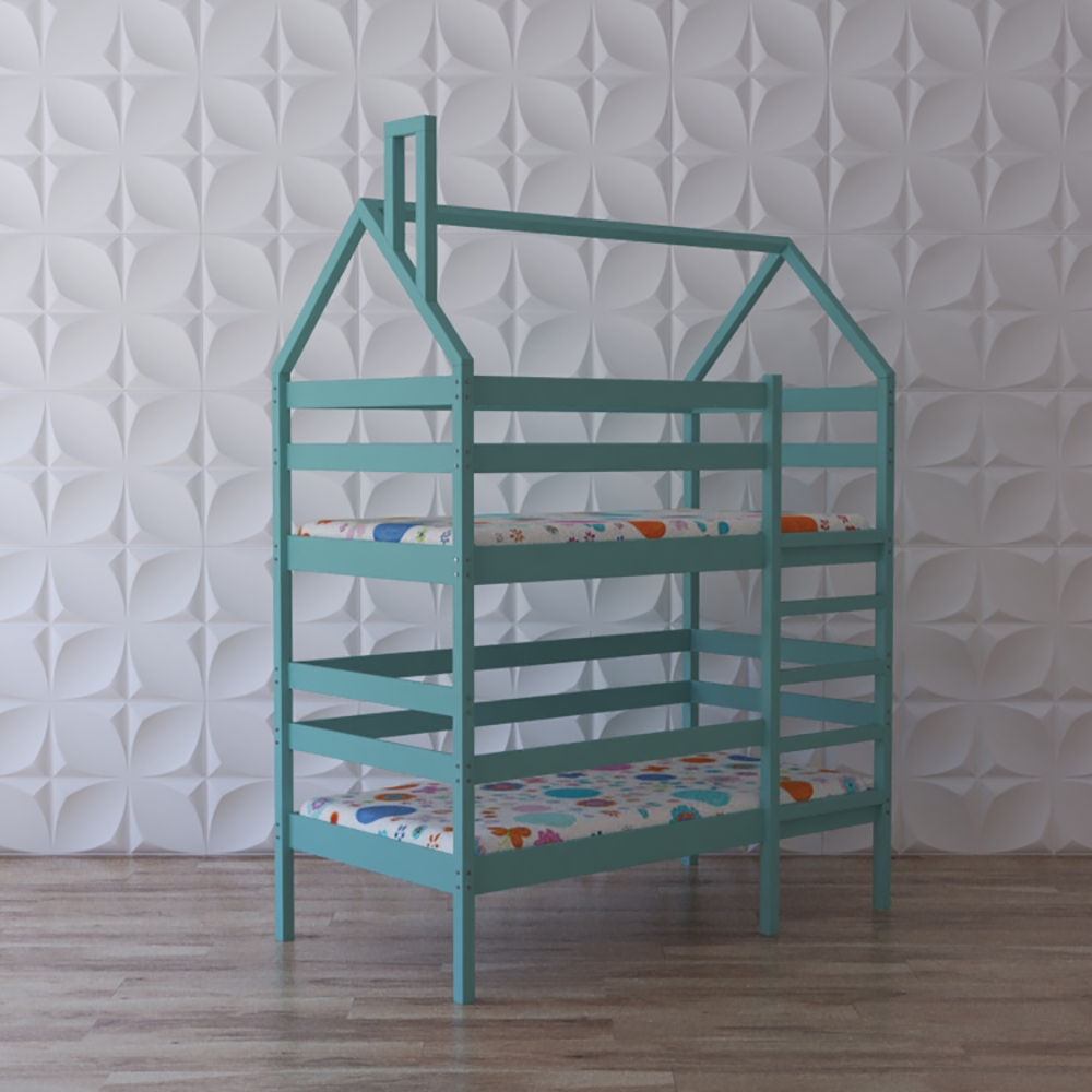 Кровать детская изготовлена из массива хвои, которая обладает лёгкостью, влагостойкостью и прочностью, а также выделяет в воздух специальные вещества, которые оказывают антисептический эффект. Двухъярусная кроватка розового цвета имеет 2 спальных места, оригинальную и интересную форму 3-D домика с печной трубой с лесенкой на верхний этаж. Комплект предназначен для оснащения групп ДОУ, развивающих центров, будет уместен и в использовании дома.