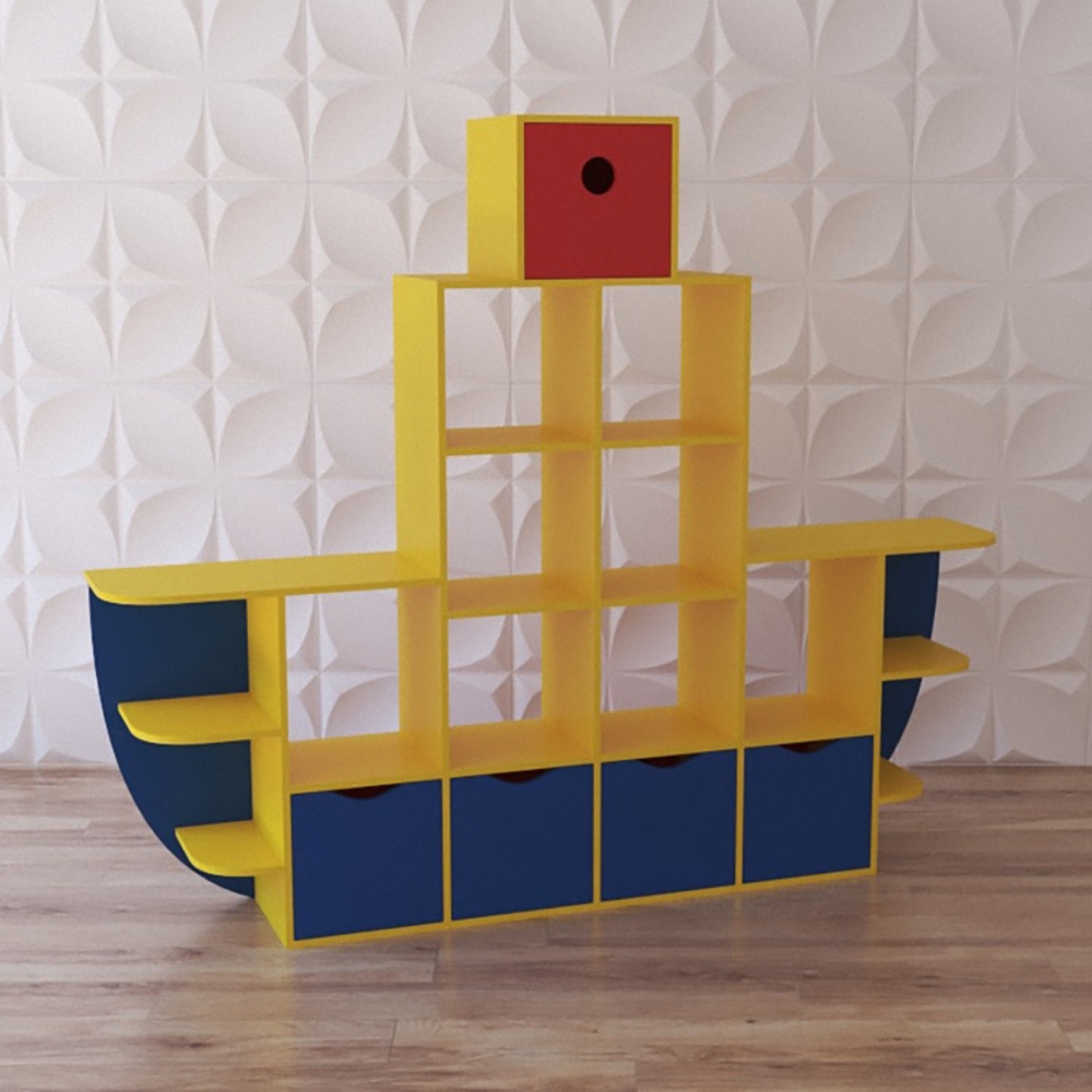 Шкаф-стеллаж представленной модели выполнен в форме корабля, имеет 16 открытых и 5 закрытых полочек, окрашен в желто-синей гамме с одиночным красным акцентом. Благодаря продуманной конструкции стеллажа хранение станет организованным и займёт намного меньше места. Стеллаж для игрушек станет отличным модулем для оснащения помещений и украсит любое помещение за счёт своего яркого и необычного внешнего вида. Этот яркий модуль предусмотрен для группы детсада, яслей, но также будет одинаково хорошо смотреться в игровом детском уголке кафе или дома в детской у малыша. Вы можете купить этот модуль недорого и напрямую от производителя у нас.