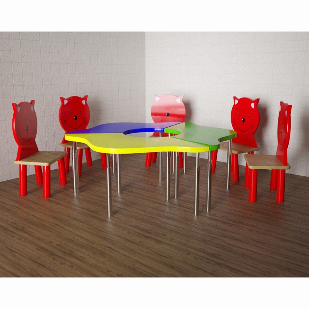 Стол имеет изящную и вычурную конструкцию, состоит из 3-х отдельных столиков синего, желтого и зеленого цветов, которые могут использоваться по отдельности, а при необходимости – сдвигаться в единую конструкцию. Каждая из частей столика имеет по 2 рабочих места. Детский стол нужен для оснащения учебными местами групп в ДОУ, коррекционных и развивающих центрах.