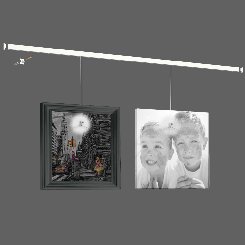 Рельсовая система, которая крепится к стене или к потолку - с тонкими подвесными лесками с крюками. К ним вы сможете вдоль стены крепить произведения искусства или презентационные материалы. При этом очень легко их переставлять, менять, устанавливать в несколько рядов и в любое положение на рельсовой системе.