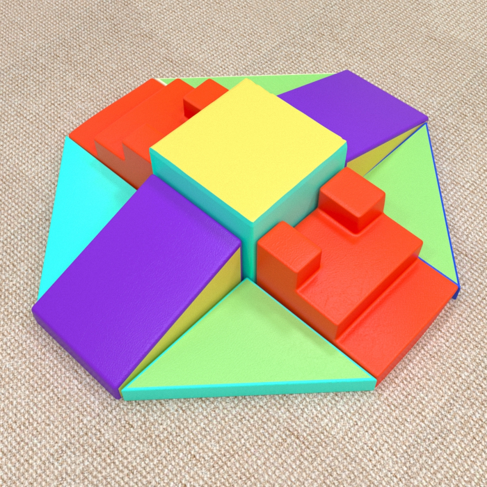 спортивный комплекс «Олимп» представляет из себя своеобразный подиум с возвышением посередине, на который дети с 2-х сторон взбираются при помощи лестницы, а с других 2-х – спускаются, как с горки. Состоит из 9 элементов разнообразных форм и цветов, объединяющихся в единый комплекс формы разностороннего восьмиугольника. Плюсом является бескаркасная конструкция модуля (это помогает избежать травмирования ребёнка), как и мягкий, упругий наполнитель, который также устойчив к разрывам и повреждениям. Покрытие легко моется.