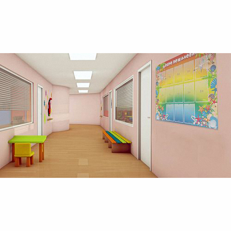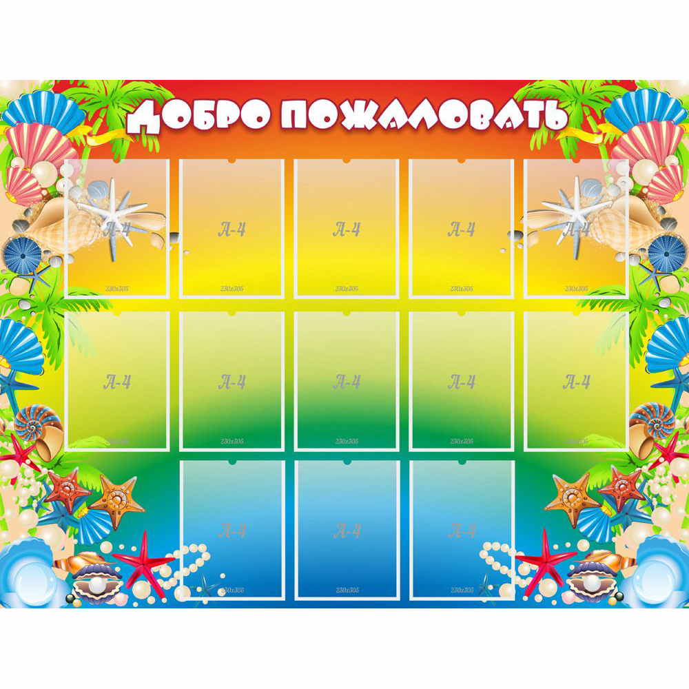 Фон цветов радуги с плавными переходами оттенков позволяет выделить многочисленные карманы формата А4, в которых можно разместить фотографии детей и воспитателей, важные объявления, плакаты, списки групп, различные информационные листы о жизни детского сада. Вырез в верхнем краю карманов позволяет легко обновлять размещенную информацию. Картинка по краям дополняется красочными обитателями подводных глубин, которые обязательно привлекут внимание ребенка.