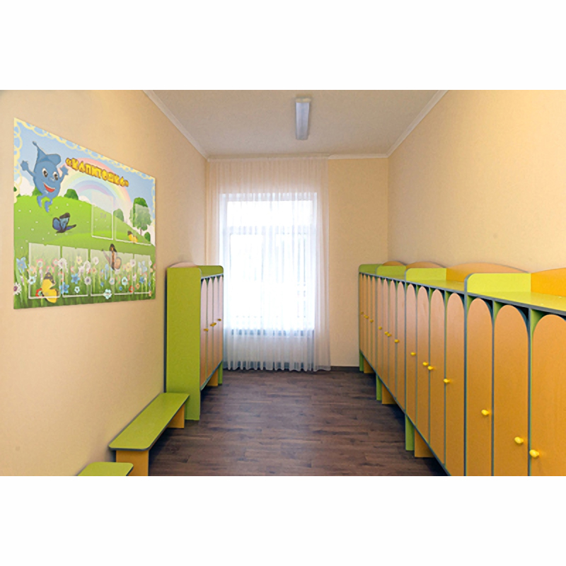 Элементы дизайна для данного стенда: зеленый луг, красивые цветы и деревья, яркая радуга и веселый Капитошка. Повсюду порхают разноцветные бабочки. Название стенда написано желтыми буквами, что делает стенд заметным издалека.