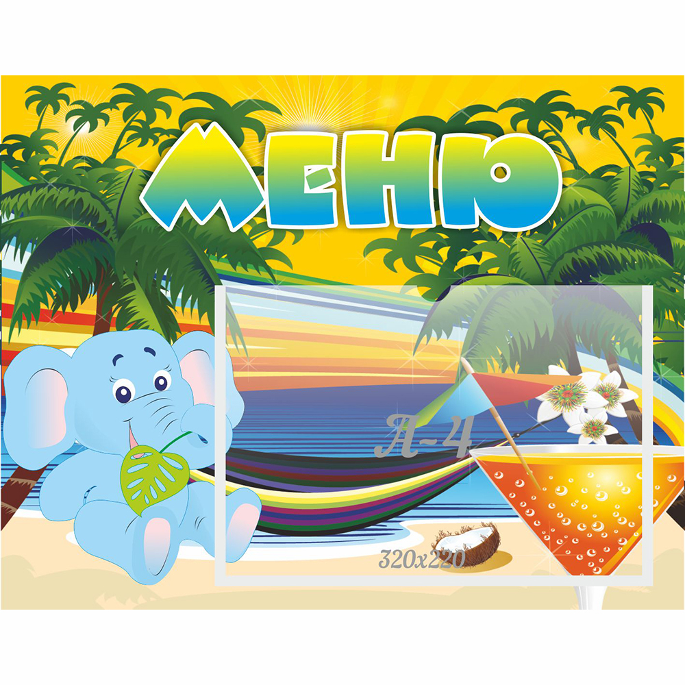 Маленький слоник любит вкусно и много покушать. Поэтому по вопросам меню можно смело обращаться к нему. Наши специалисты разработали необычный дизайн стенда. Информационный карман расположен горизонтально. Он прозрачный, изготовленный из прочного пластика. В качестве фоновой картинки выбран тропический берег. На это указывают пальмы, растущие возле океана. Дизайн стенда порадует не только малышей, но и взрослых. Стенд рассчитан на ежедневную замену информационных листов, ведь при его изготовлении используются только качественные материалы. Стенд компактный, его легко монтировать на стену.