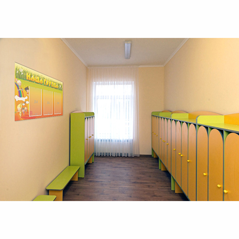 Информационные карманы размещены в один ряд. Это вносит некие деловые нотки в общий дизайн стенда. Малышам понравится забавная картинка: озорные дети и разноцветная радуга. Стенд предполагает размещение любой значимой информации: списка группы, меню на день, режима дня, проводимых мероприятий в детском садике.