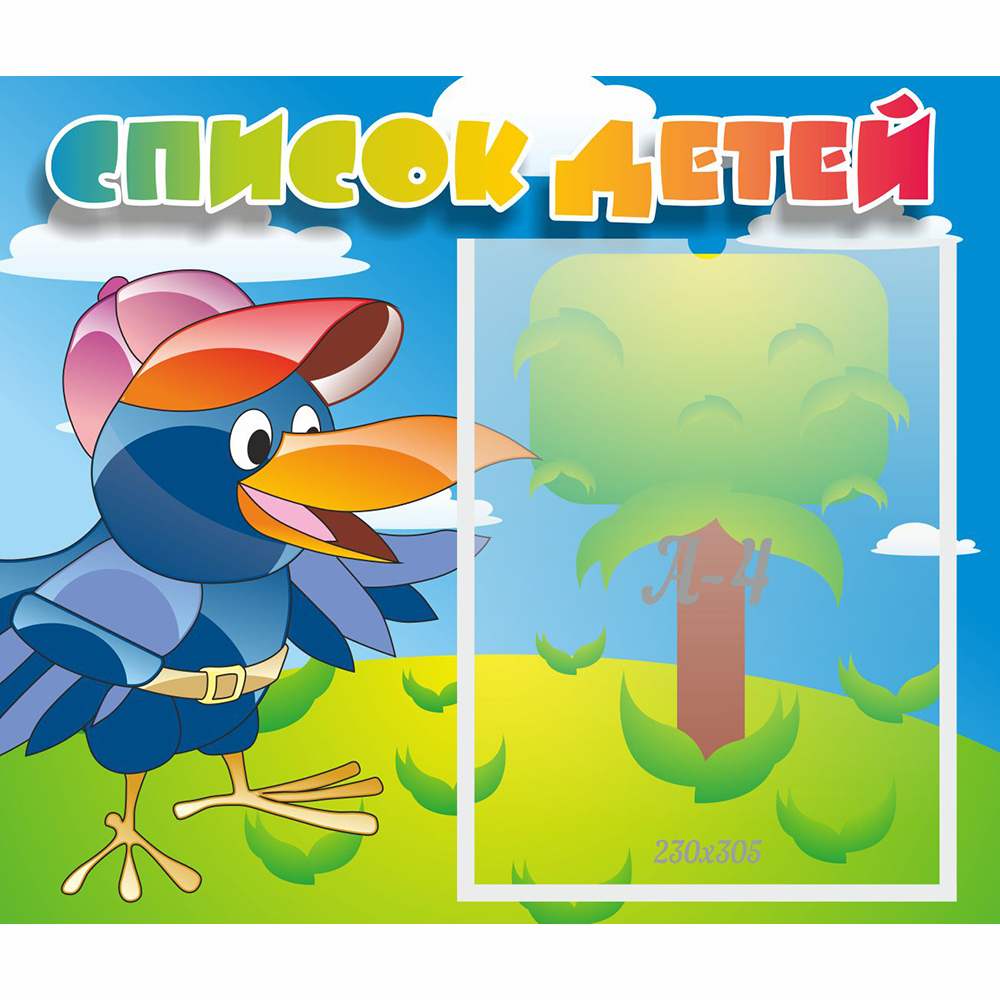 Всегда важно держать под рукой список собственной группы. Но листик со списком может потеряться или дети могут его случайно порвать. Тогда на помощь приходит настенный стенд, который удобно монтировать над столом воспитателя. Веселая ворона в модной кепке расскажет ребятам, что лист на этом стенде – важный документ, и что его нельзя портить. Замена списка группы происходит достаточно легко. Информационный карман имеет срезанный верхний правый уголок. Рисунком для фона выбрана поляна и большой зеленый дуб. Название стенда выполнено большими заглавными буквами, в гамме от синего цвета к красному.