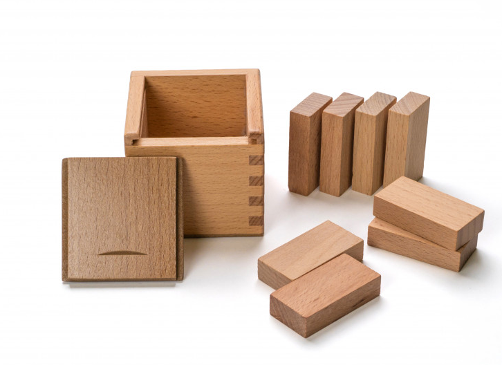 Четвертый: восемь плашек в виде прямоугольных брусков, которые также складываются в куб - «куб из брусков». Дети превращаются в начинающих «строителей», обучаясь собирать из отдельных элементов цельный предмет.