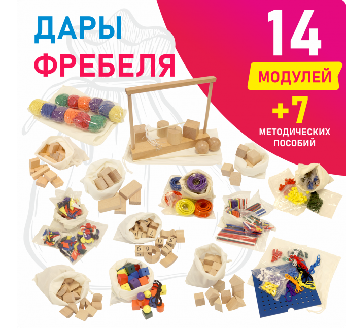 Игровой набор Дары Фребеля в мешочках 14 модулей с методическими пособиями 7 книг