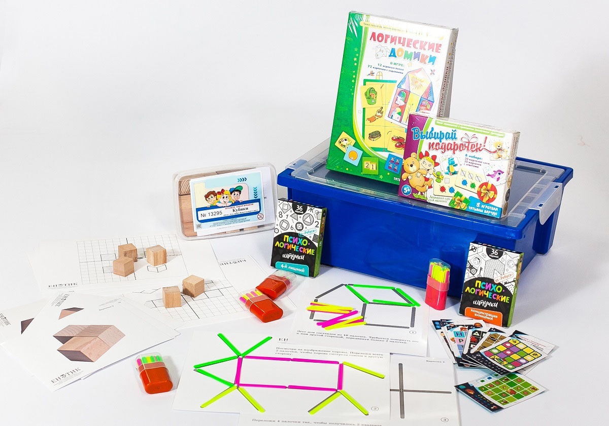 - Комплект № 2 «Логика». В состав комплекта входят настольные игры, направленные на развитие логического мышления детей дошкольного возраста, карточки с заданиями, «Обучающий планшет ДО» или аналог, комплект карточек с заданиями по теме «Части и целое», «Логика» (кубики с набором заданий), видео-контент, журнал проекта.