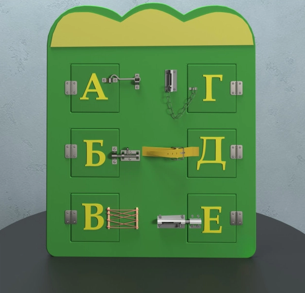 Разные замки и шпингалеты, которые научат малыша быть ловким, чувствовать и осознавать движения своих рук. Что может быть интереснее, чем движение шпингалета в одну сторону, затем в другую. Вырезанные буковки в дверцах, помогут детям лучше запоминать, развивая тактильную и зрительную память. Это очень хорошая тренировка ума.