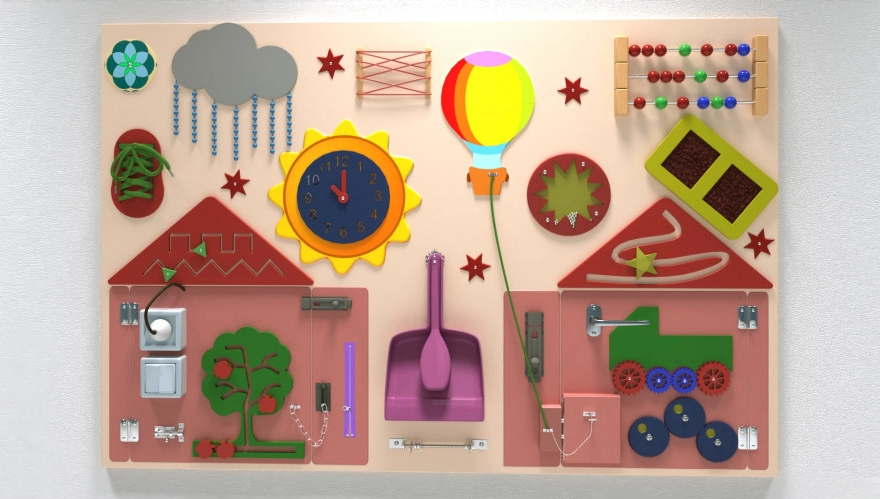 Настенная панель представленного образца выполнена из дерева, основание окрашено в нейтральный бежевый цвет, а развивающие детали и приспособления выделяются яркими акцентами.